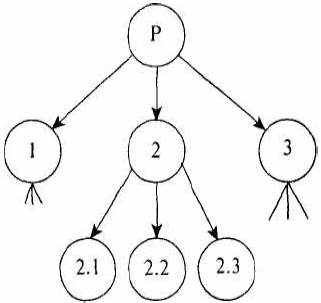 Р – высший уровень руководства; 1, 3 – вспомогательные подразделения; 2 – основное подразделение и его подструктуры (2.1, 2.2 и 2.3) – вспомогательные подразделения; 2.1 – группа приема заказов; 2.2 – обслуживающие группы (бухгалтерия, отдел кадров, техническое обслуживание и др.); 2.3 – группы заготовителей (заготовка сырья, материалов, товаров и др.) Рис. 1. Линейный тип организационной структуры
