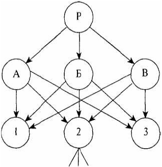 Рис. 2. Функциональный тип организационной структуры Р – высший уровень руководства; 1, 2, 3 – административно-руководящие и вспомогательные подразделения; А, Б, В – крупные сервисные единицы-подразделения