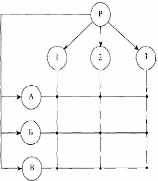 Рис. 2. Функциональный тип организационной структуры Р – высший уровень руководства; 1, 2, 3 – административно-руководящие и вспомогательные подразделения; А, Б, В – крупные сервисные единицы-подразделения